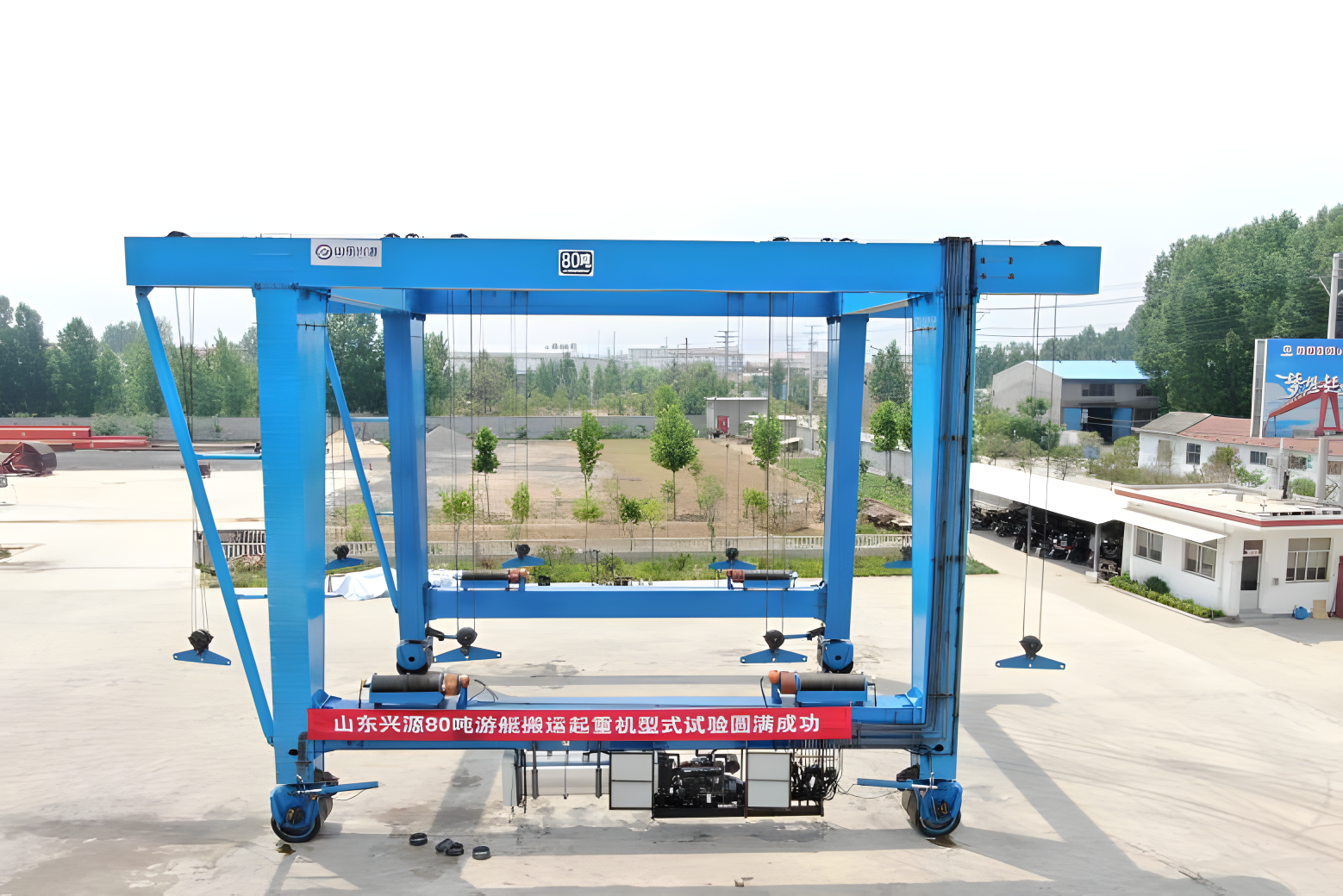 游艇搬運(yùn)機(jī)其主要用于船艇的上水下水、吊運(yùn)等工況,可以方便、快捷地滿足不同船艇的吊運(yùn)保養(yǎng)、維修或廠區(qū)間的移運(yùn)工作,安全可靠性很強(qiáng)。上部結(jié)構(gòu)為雙門架“U”型連接框架,以便于在碼頭或廠區(qū)滿足不同船型的順利進(jìn)水、出水、吊運(yùn)等工作。